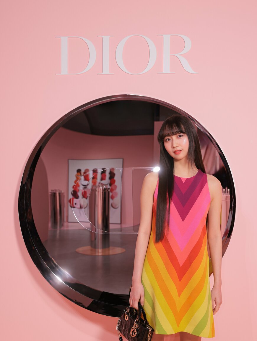 ディオールのピンク&オレンジの派手色ミニワンピースで、二の腕や脚を露出。黒のハンドバッグで引き締めています。