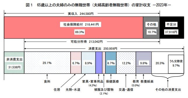総務省統計局の「家計調査報告〔家計収支編〕2023年(令和5年)平均結果の概要」によると、65歳以上・無職世帯の家計収支は以下のようになっています。