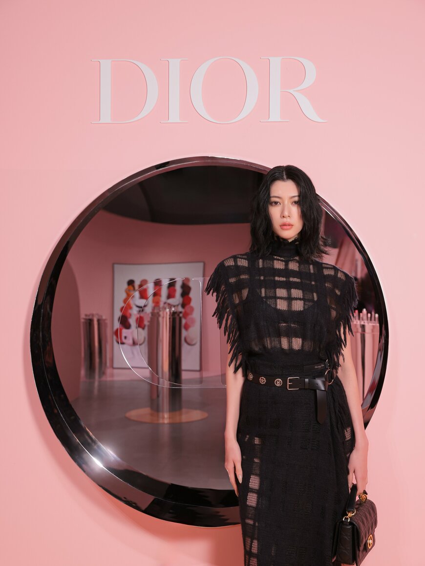 三吉彩花は透け感のあるブラックのチェックドレス姿。小物もブラックとゴールドでそろえ、クールな印象です。