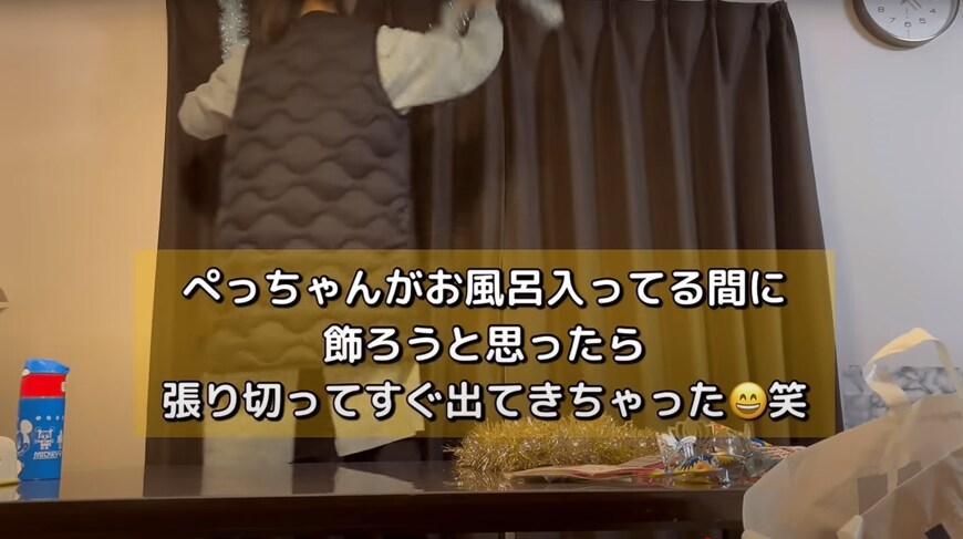 おりなちゃんがお風呂に入っている間に飾り付けをしようとしたみどりママですが、ケーキが食べたくて張り切っているおりなちゃん、予想外に早くお風呂から出てきてしまったようです(笑)