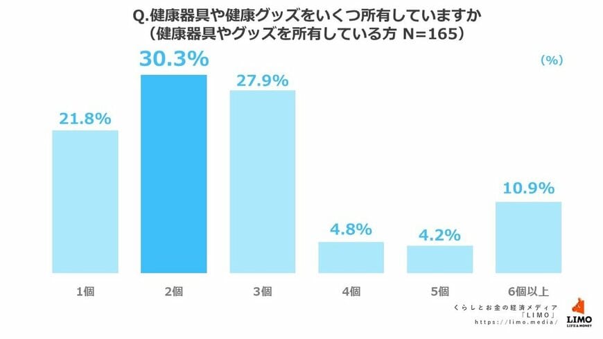 健康器具や健康グッズに関しては、複数個所有するという方が多いことが分かります。さらに回答者の10.9%の方は「6個以上」と回答している点も印象的な結果となりました。