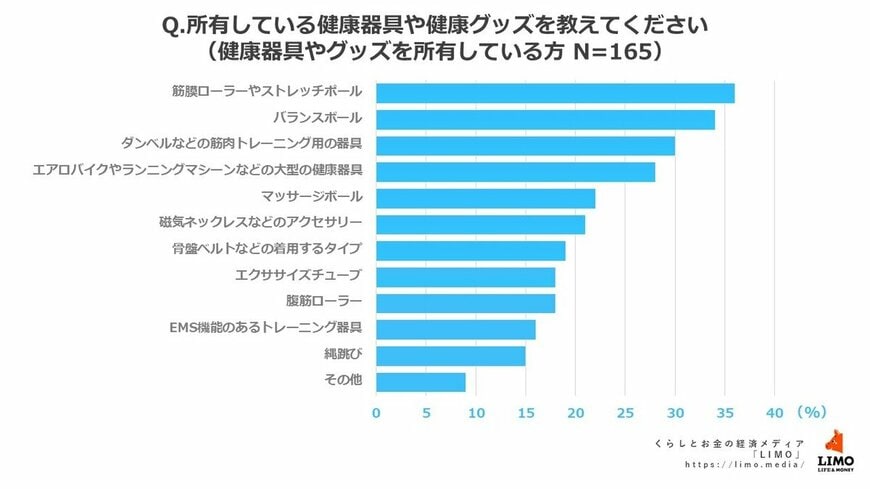また「バランスボール」が33.9%、「ダンベルなどの筋肉トレーニング用の器具」が30.3%という結果になっており、筋膜ローラーやストレッチボール以外の器具も人気です。