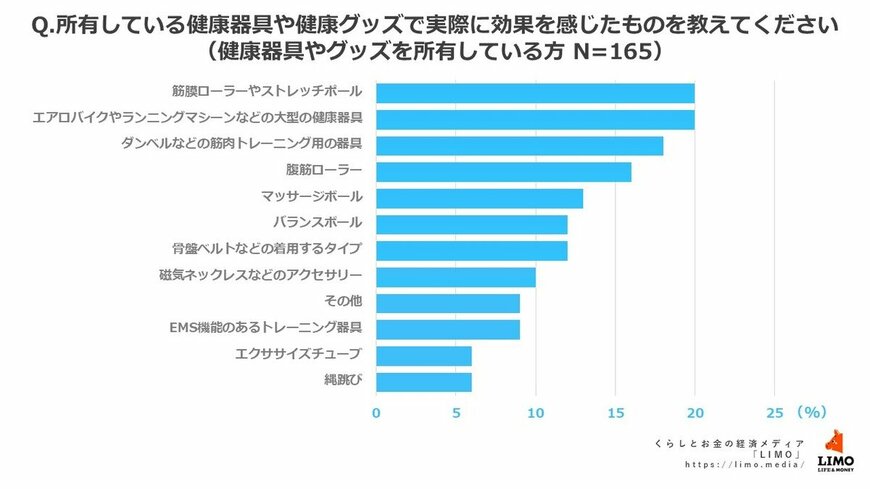 最も多かった回答は「エアロバイクやランニングマシーンなどの大型の健康器具」「筋膜ローラーやストレッチポール」の2つが同率で、回答者の20.0%でした。「エアロバイクやランニングマシーンなどの大型の健康器具」は所有率は4位でしたが、効果を感じたものとしては1位にランクイン。