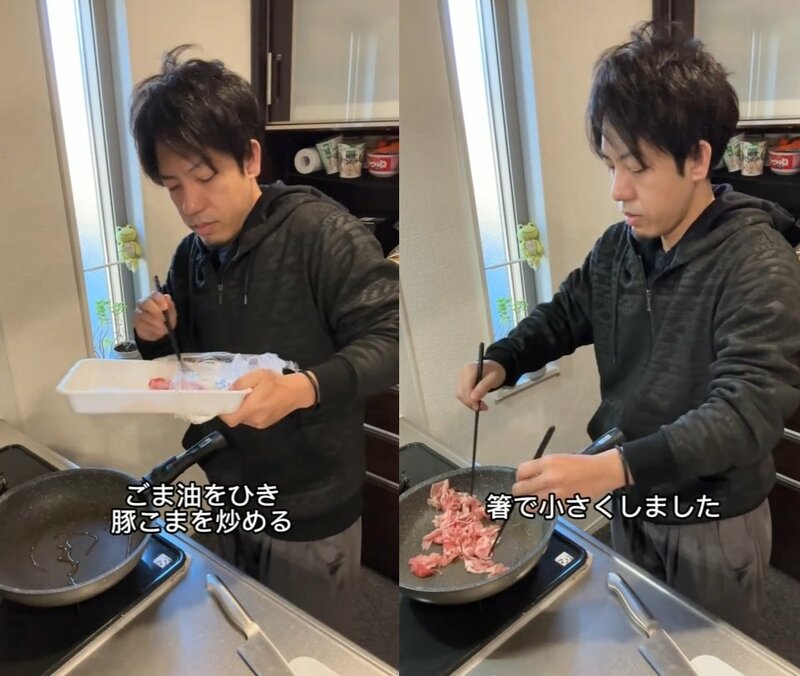 3. 【シングルファザー豚こまちんげん菜弁当】豚こまは箸を使わずに小さく!
