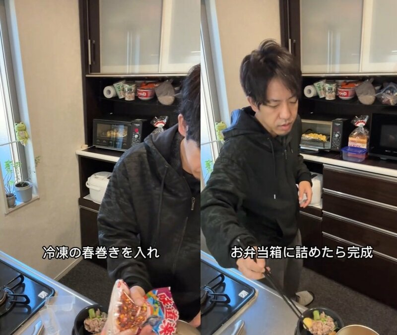 炒め物以外にも、冷凍食品の春巻きと、塩コショウで味付けしたポテトも入れます。