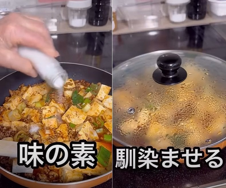 ひき肉、豆腐、青ネギに「麻婆豆腐の素」を加えていきます。
