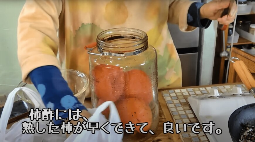 熟していた柿を利用し、柿の表面には、柿酢を作るのに必要な酢酸菌や酵母菌がついているということで、柿を洗わず利用します。