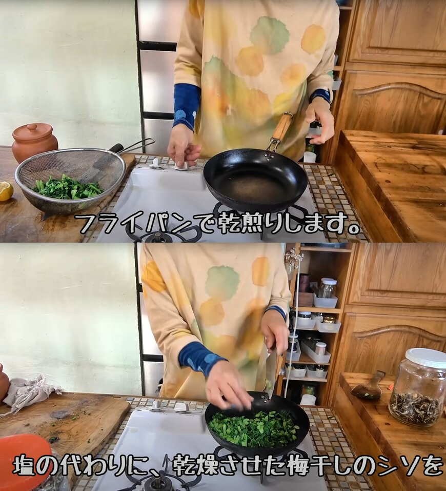 まずは大根の葉っぱ。塩気は乾燥させた梅干しのシソを代用します。食品を余すことなく利用し、栄養価ばっちり!