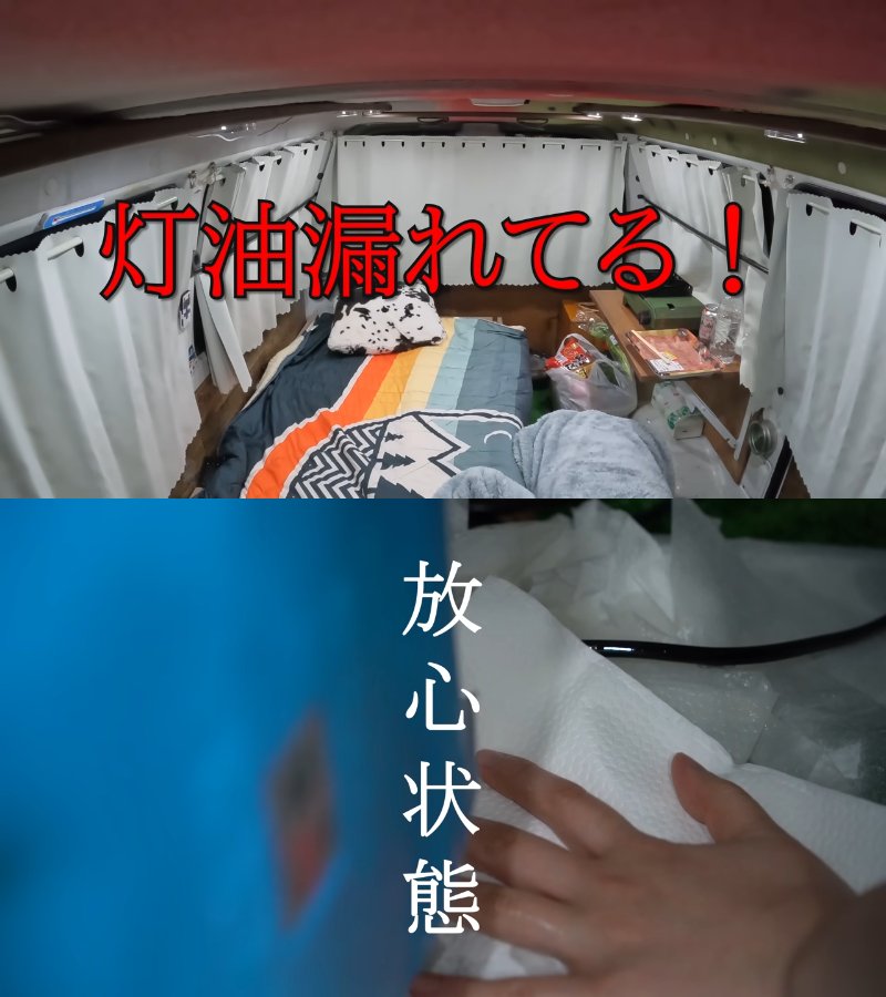 この日はFFヒーターの故障により、ヒーターなしで車中泊をしなければならなくなりました。外は-11度。「最悪です」とぼやきつつ、放心状態で漏れた灯油の掃除や窓を開けて換気を行いました。安全を確認して撮影を続行します。