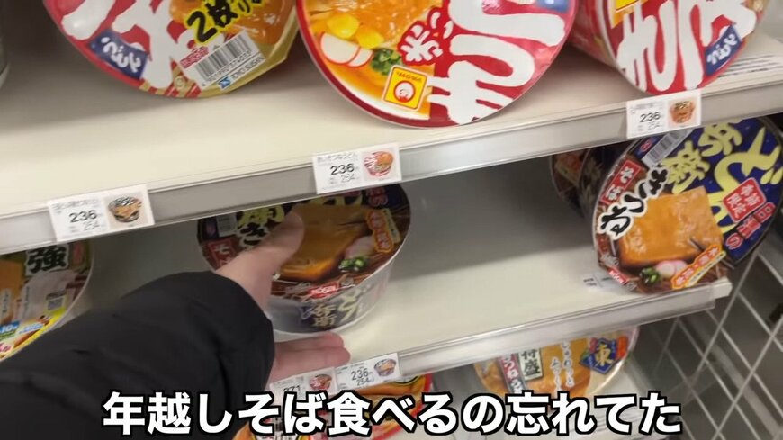 そこでコンビニに入店し「年越しそば食べるの忘れてた」とカップそばをゲット。