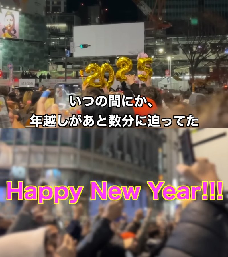 腹が満たされたちえ丸さん。まもなく年越しなので、人の多さにビビりながら、渋谷の中心街に向かい、カウントダウンする人々を眺めました。