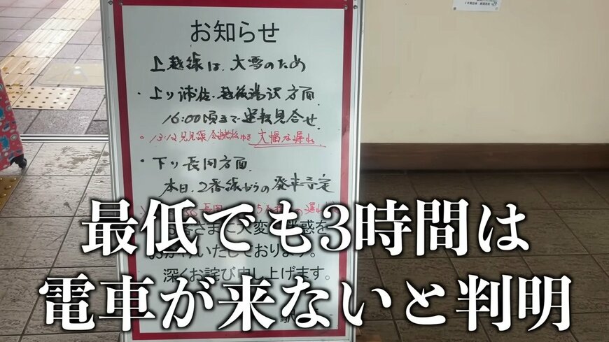 果林さんは新潟県小出駅まで到着。しかしここで運休が発生。最低でも3時間は電車が来ない事態となります。