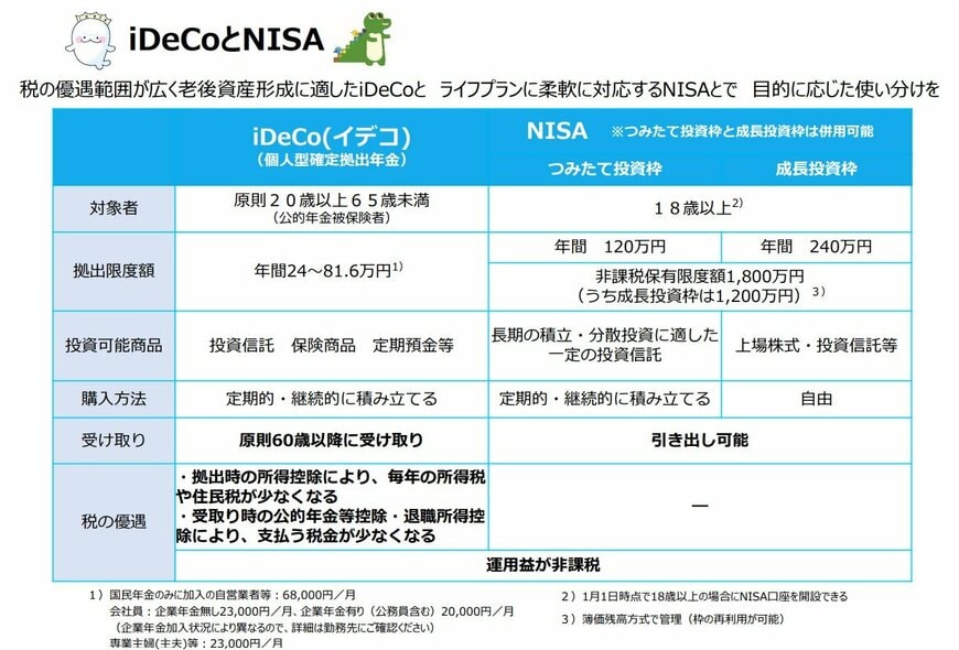 そのため、預貯金を着実に増やすだけでなく、資産運用も視野に入れると良いでしょう。税制優遇制度であるiDeCo(イデコ:個人型確定拠出年金)やNISA(ニーサ:少額投資非課税制度)の活用も有効な選択肢となります。