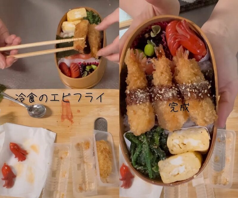 3. 【現役美容師のエビフライ弁当】ご飯の上に「隠れ明太子」