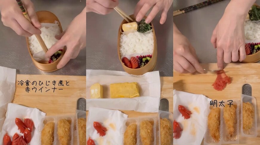さて、冷凍食品のヒジキ煮(筆者もたくさんお世話になっている便利で美味しい逸品)と、飾り切りが入った赤ウィンナーを詰めていくようです。