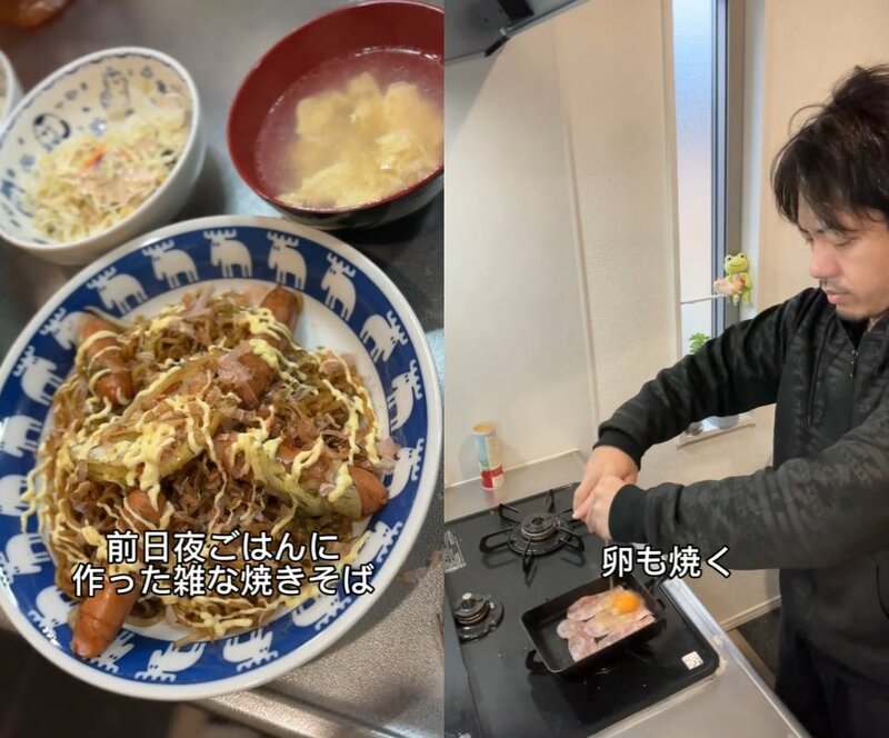 1. 【シングルファザーベーコンエッグ丼と焼きそば弁当】前日の夜ご飯は焼きそばでした