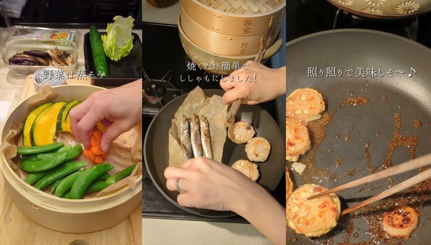 まずは、かぼちゃ、スナップエンドウ、人参...赤、黄、緑の綺麗な野菜を蒸してヘルシーに仕上げます。