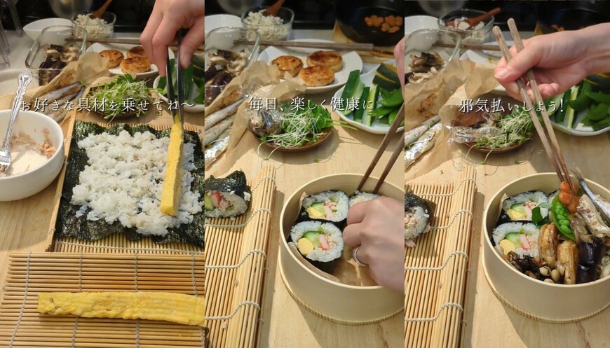 卵にキュウリ、カニカマ、ツナマヨ、スプラウトと、5種の具をのせて巻いていきます。