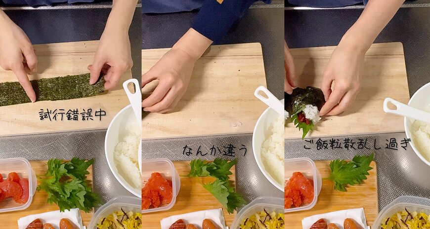 「なんか違う」と思いつつ、ご飯粒も散乱させつつ、でもできあがっていくのは美味しそうな明太子おにぎりや梅干しのおにぎり。