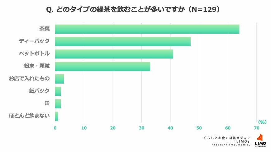 もっとも多かったのは64.3%で「茶葉」、続いて「ティーパック」「ペットボトル」と続きます。店舗で飲むことや、紙パック・缶といった形状は一桁台となっており、それらの形状ではあまり飲まれていないことがわかります。