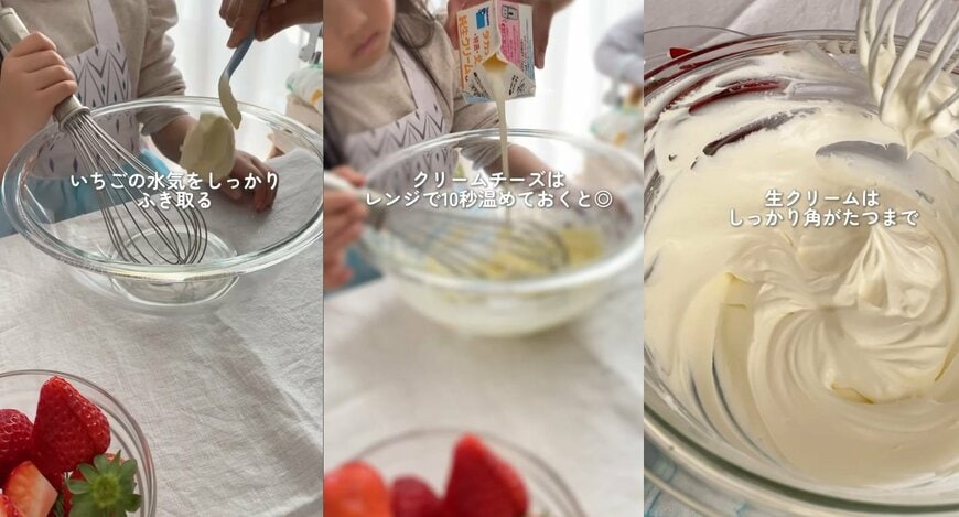 いちごの水気をしっかりふき取り、クリームチーズを混ぜやすく柔らかくしたり、生クリームはツノが立つまでしっかり泡立てる...小さなコツが成功の秘訣のようです。