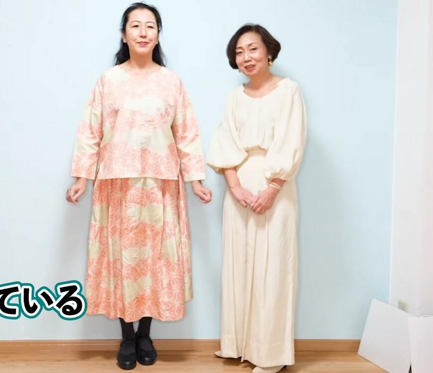 次のモデルの女性は、ハリのある着物の生地のセットアップを着て登場しました。ハリがある生地は、ラインが体から離れてしまうので、どうしても着太りした印象が出てしまうそうです。