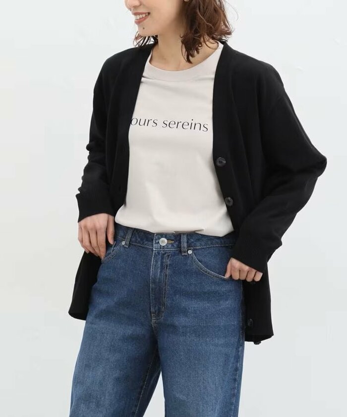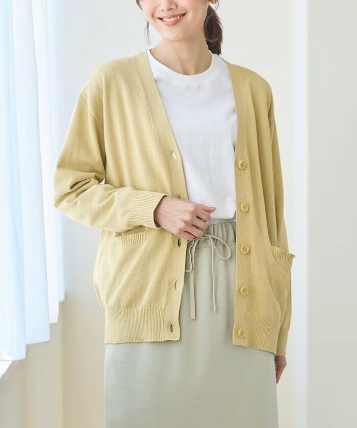 また、顔周りをすっきり見せるVネックは、どんなコーデにも合わせやすいシンプルさが特徴です。ゆったりめの幅とヒップまで隠れる丈感で体型カバーができるのもうれしいですね。カーディガンには大きめボタンとフロントポケットが付いており、アクセントをプラスしてくれています。ボトムスを選ばず、普段使いからオフィススタイルまで幅広い着回しができます。
