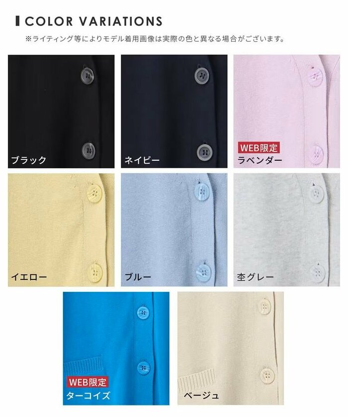 - カラー:ブラック、ネイビー、杢グレー、ラベンダー、イエロー、ブルー、ターコイズ(ラベンダー・ターコイズはオンラインストア限定)