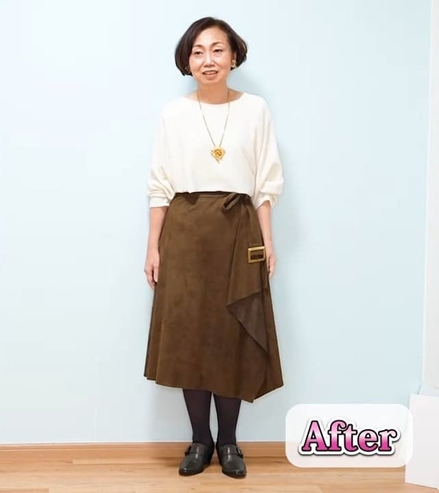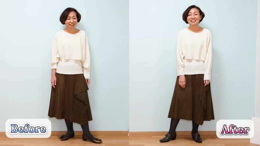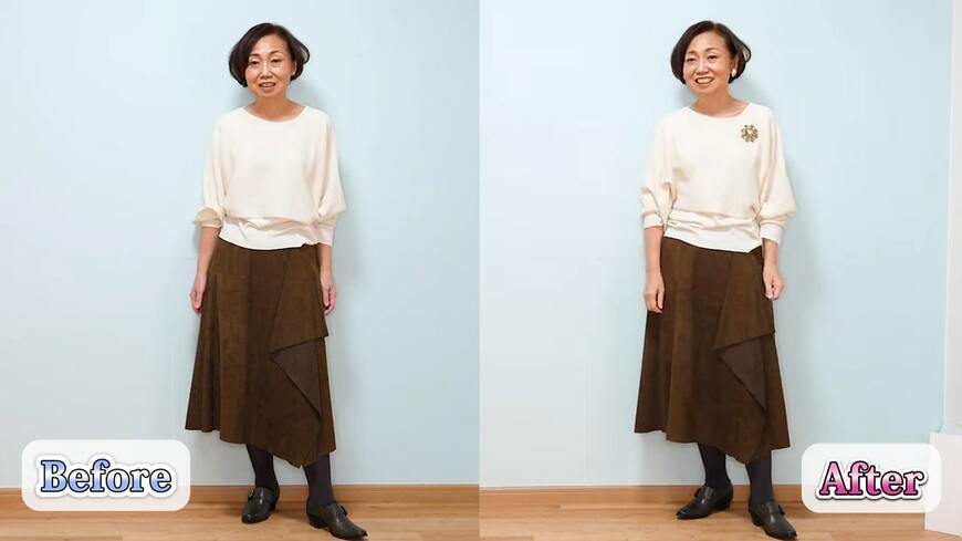 2. 【脱おば見えファッション】ビフォーアフター!シンプル服を上品な華やかさに着こなし♪