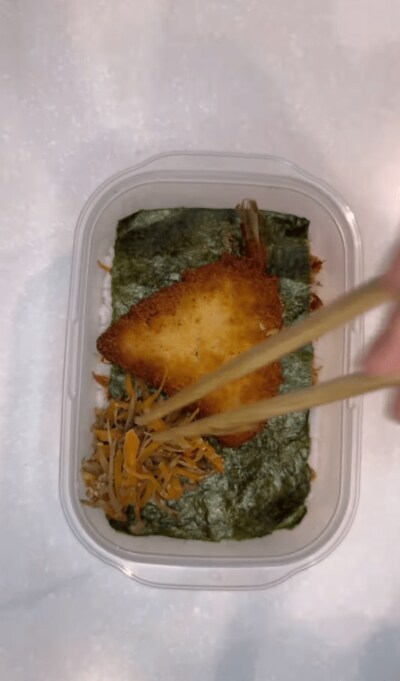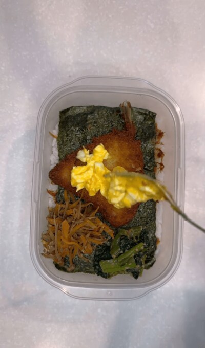 海苔弁の上に今回のメインのおかず「アジフライ」を中央に置いたら、周囲におかずを並べていきます。今回はきんぴらごぼうとほうれん草の胡麻和えのようです。