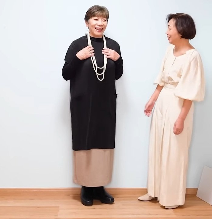 お友達はブラックのワンピースにベージュのスカート、3連のパールネックレスというコーディネートで登場。Iライン(縦のライン)が印象的で素敵なファッションですが、よりおしゃれに変身させていきます。