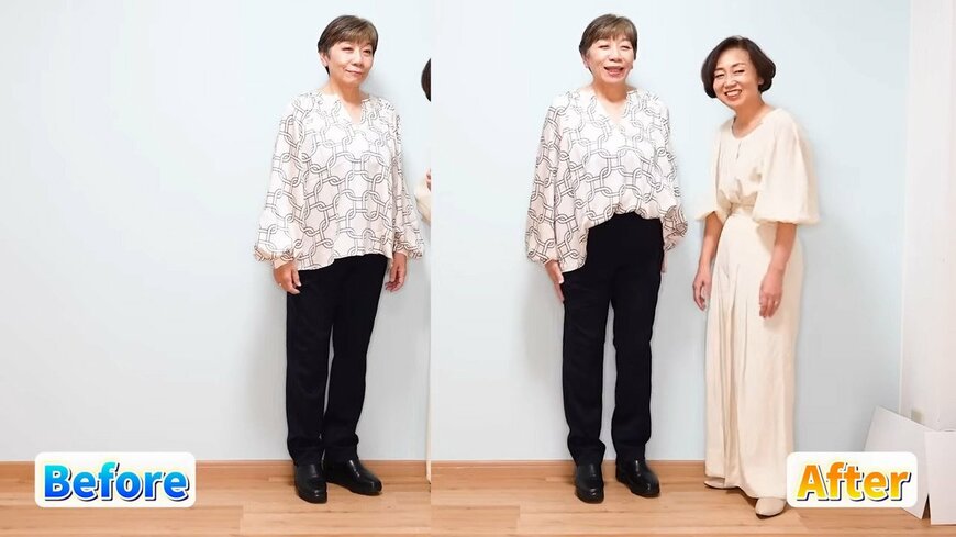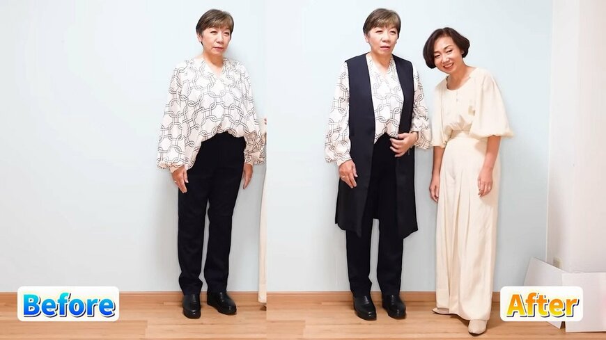 こちらが変身後の姿です。現在流行中のジレを1枚羽織ることで、さらにおしゃれに痩せて見えるようになりました。コーディネートのテクニックを紹介していきます。