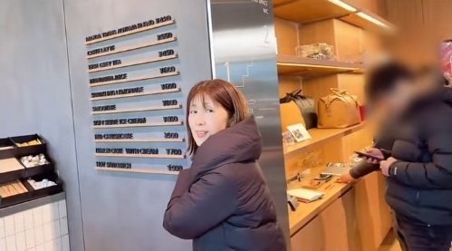 白ニットがお似合いで、上品な美しさを誇るチカコさん。メニューを指さしてかわいらしいです。