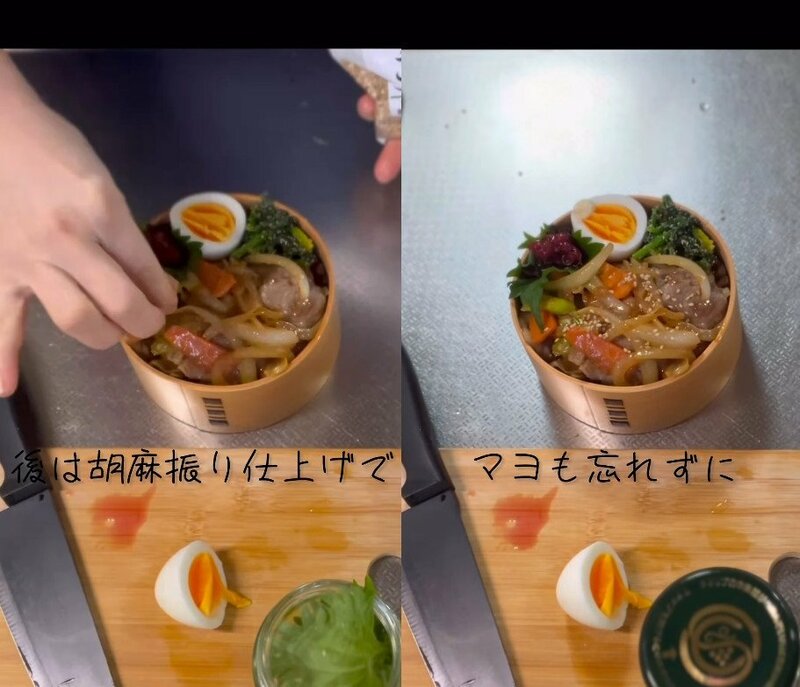 最後に胡麻を振りかけて、ゆで卵にマヨもトッピングして、そろそろできあがり!