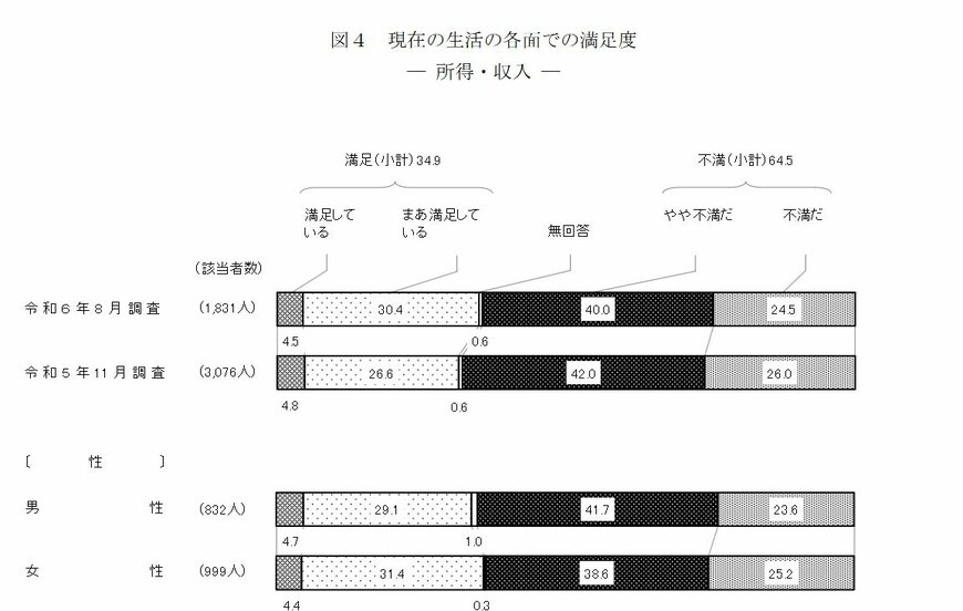 しかし、冒頭でもご紹介した世論調査の結果によると、収入に対する満足度には男女差は特にないことがわかります。