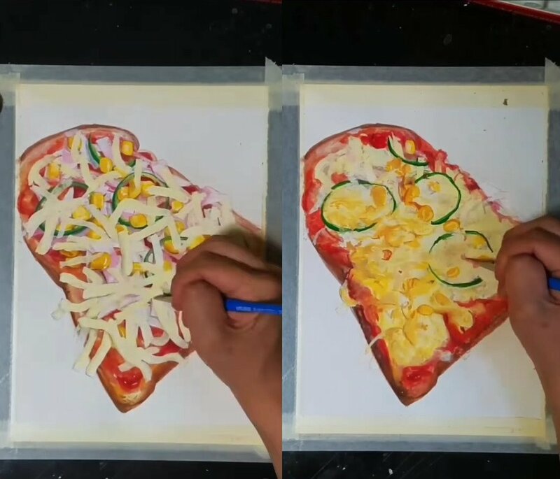 もちろんピザのチーズなので「こんがりとろけている感」がめちゃくちゃ重要なのですが、これも見事に絵筆で再現。