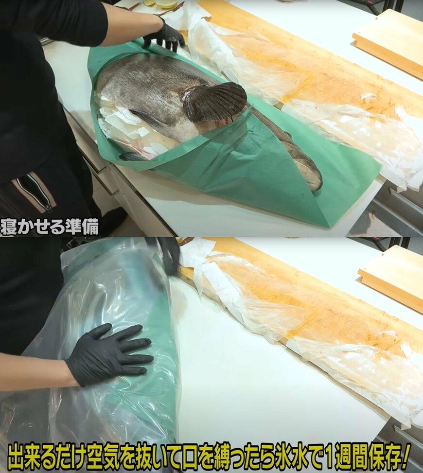どうにかこうにか内臓を綺麗にしたら、お腹にキッチンペーパーを詰め、グリーンパーチ(魚専用の保存用包装紙)で巻いて1週間氷水で保存します。
