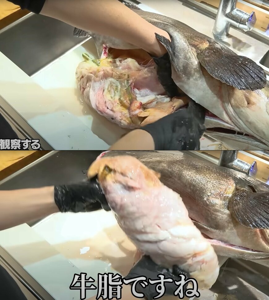 大きく膨らんだお腹に包丁を入れると、登場したのは牛脂...と見まごうほど脂ののった内臓。