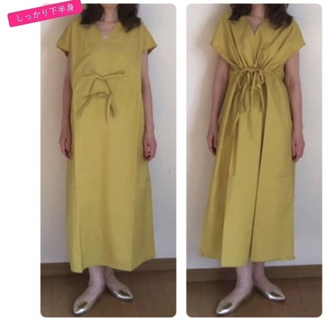 こちらの下半身のボディーラインに自信がない女性は、ウエストマークして細いウエストラインを強調。スリムな印象に見せています。