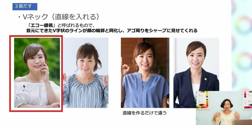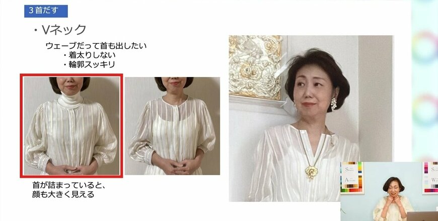 こちらの写真は、同じブラウスを着まわしたもの。インナーにタートルネックを着たもの、普通のインナーを着て首を露出したもの、上のボタンを開いてVラインを強調したものと3種類ありますが、フェイスラインのすっきりさは歴然ですね。