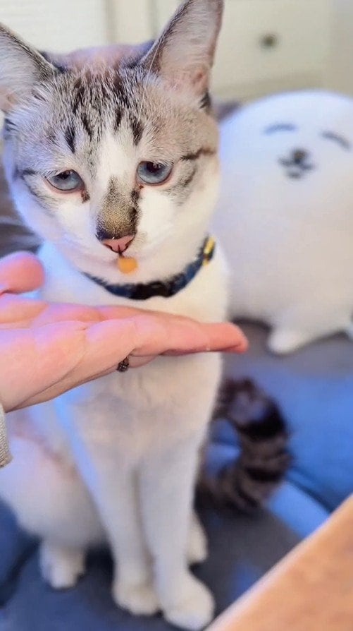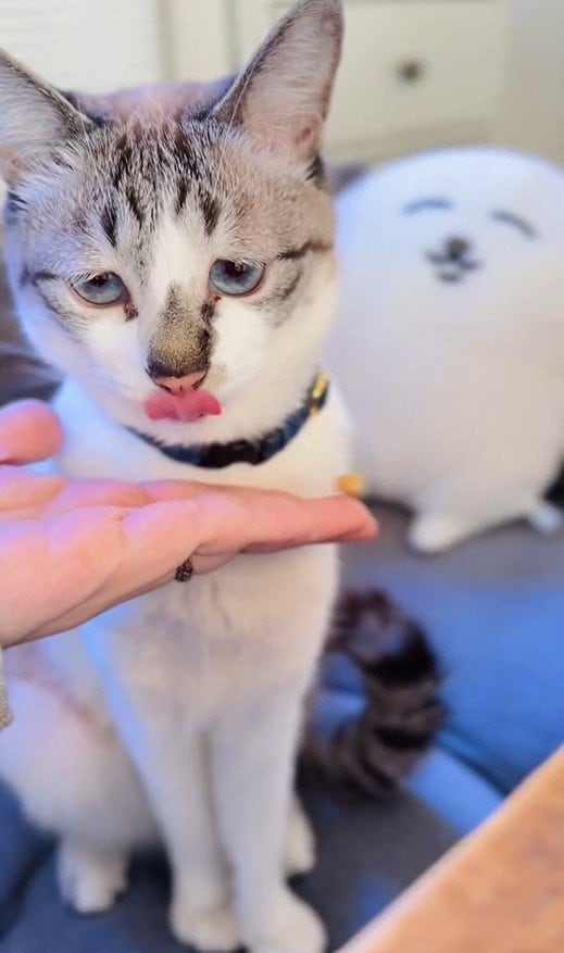 小さくしたクッキーを手のひらに乗せると、ミントちゃんはペロリと口を動かします。味わっているのかと思いきや……?