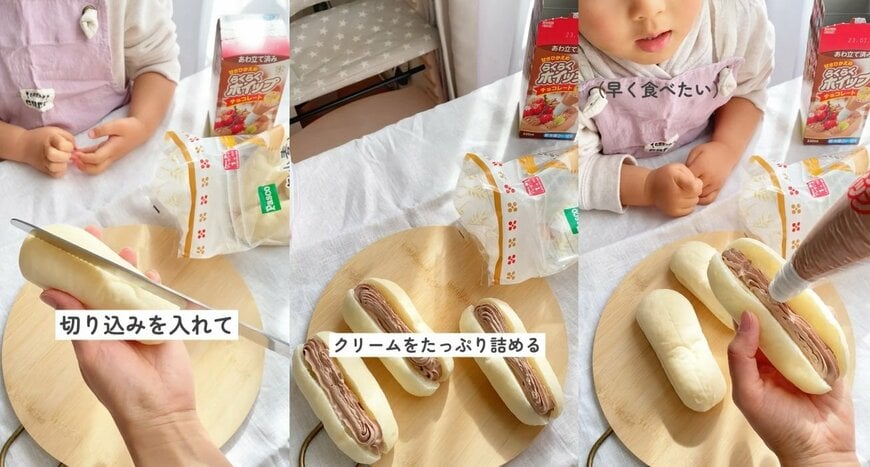 まずはパンに切れ込みを入れ、そこに市販のホイップクリーム(チョコ味)を絞ります。