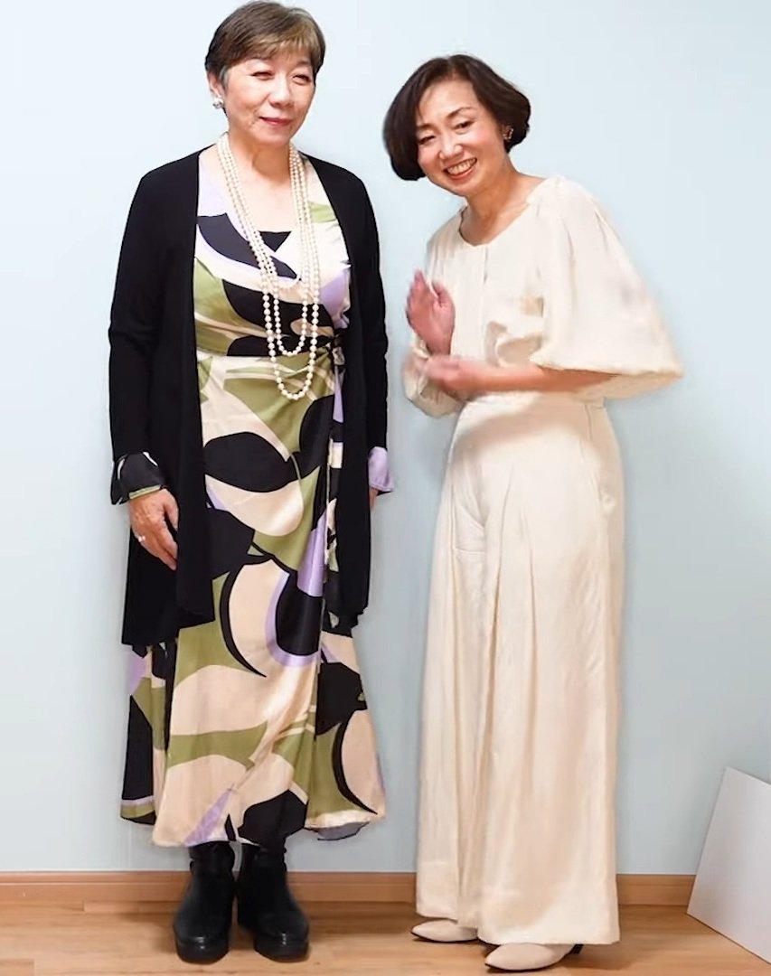 素敵なドレスに黒のロングカーディガンを羽織りました。ドレス1枚だと柄部分の面積が大きく華やかな印象ですが、カーディガンで面積を抑え、少し派手さを抑えて、なじみやすくなっているのがわかります。