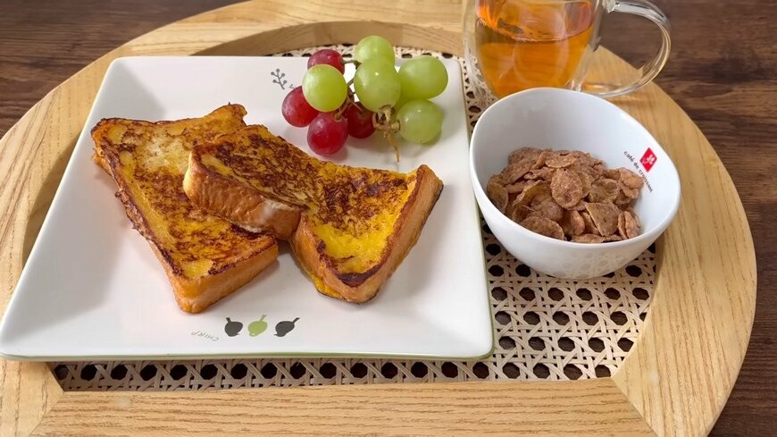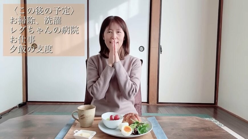 歩夢さんを見送ってから、ななこさんは自分の朝ご飯タイム。パンや野菜、果物など爽やかなメニューをいただきます。