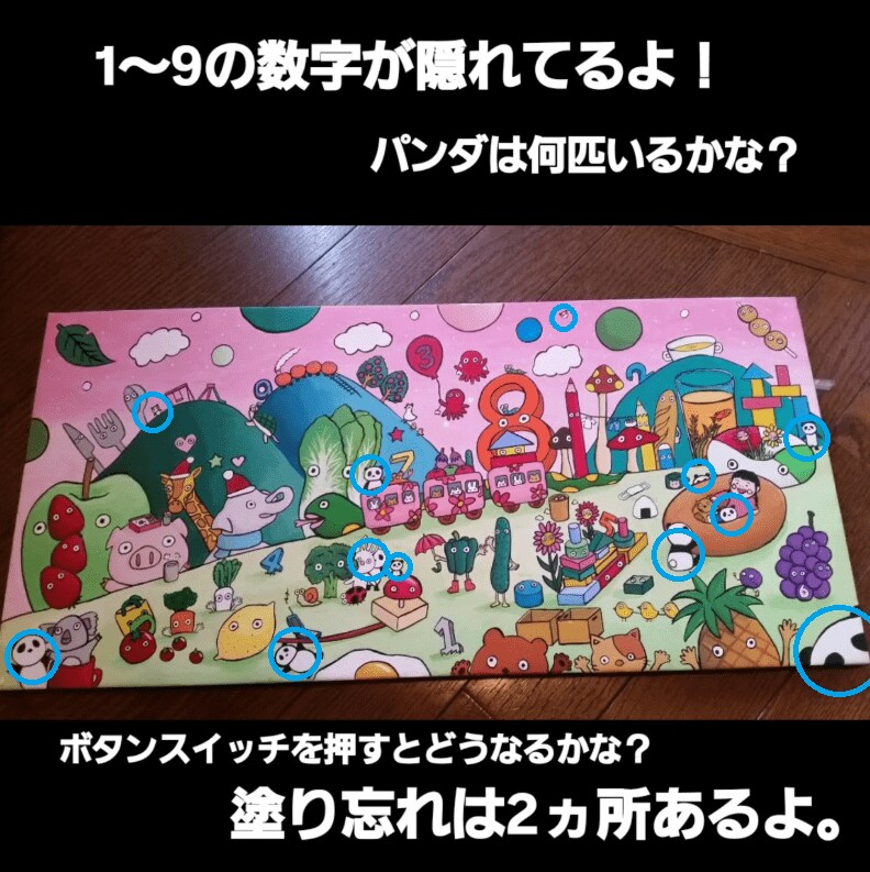 「塗り忘れは洗濯物で干しているパンと、ドーナツ横のパンダの尻尾です」