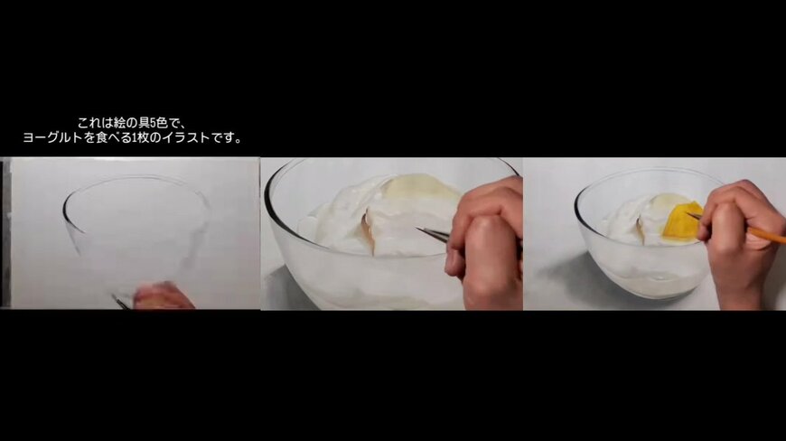 「これは絵の具5色で、ヨーグルトを食べる1枚のイラストです」