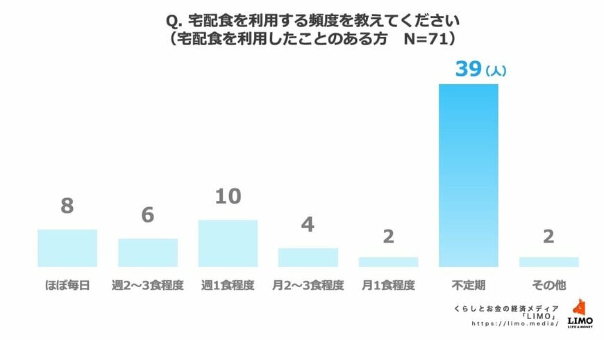 もっとも多い回答が「不定期」で54.9%と半数を超える結果に。「週1食程度」「ほぼ毎日」という結果が続きます。意外にも「ほぼ毎日」という方が約1割もおり、宅配食の利用頻度が高いことがうかがえます。