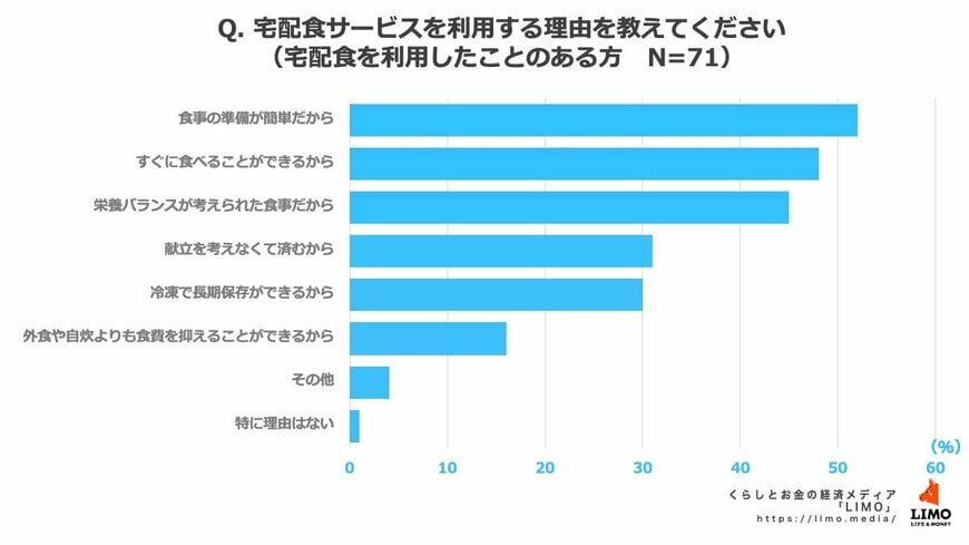 「食事の準備が楽だから」がもっとも多く、唯一半数を超える結果に。続いて「すぐに食べることができるから」という時短や効率を求めている方が多いことがわかります。