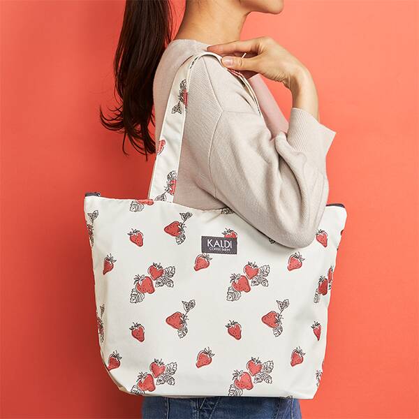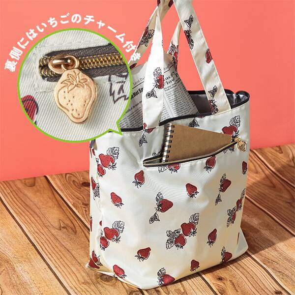 軽くて丈夫な素材のいちご柄トートバッグは、簡易式の保冷機能つき。外ポケットのファスナーのチャームにもイチゴのモチーフがあしらわれています。サイズは、縦28.5×横39×マチ14.5cm、持ち手49cmとなっています。