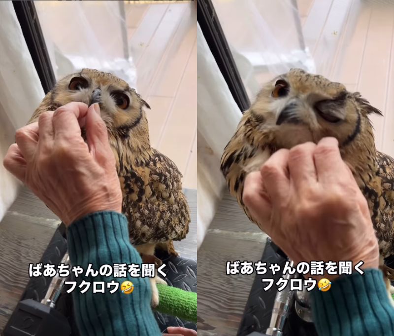 1. 【人の話を聞くフクロウ】ベンガルワシミミズクのラテちゃん、ばあちゃんが大好き!
